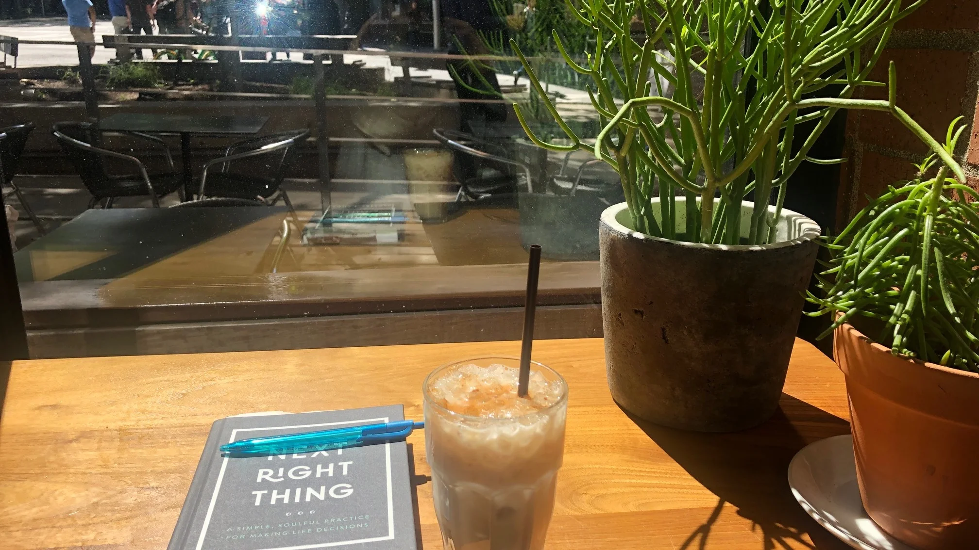 While waiting in line, I saw that there were no empty seats in the place….except ONE. Right behind me, in a corner facing the street, was a single open seat. I sat down with my book and knew that spot at the table had been waiting just for me. The sun shone down on the pages of my latest read, The Next Right Thing by Emily P. Freeman.